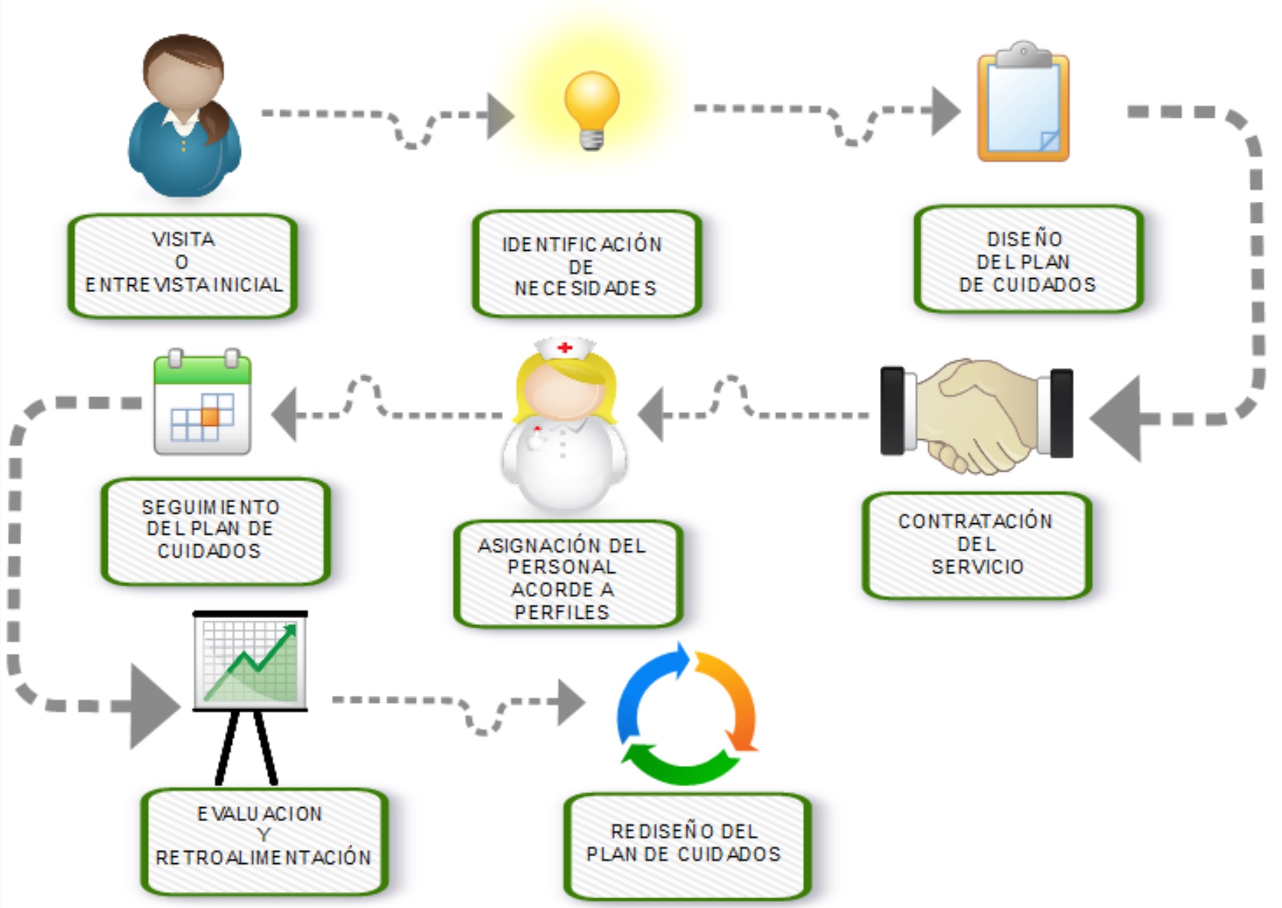 Desarrollamos además procesos de aseguramiento de la calidad del servicio, por lo tanto identificamos que el perfil de la enfermera sea acorde a las necesidades y características de la persona , procuramos mantener bajo el índice de rotación del personal , realizamos una cercana supervisión a través de visitas de valoración, orientación y retroalimentación.